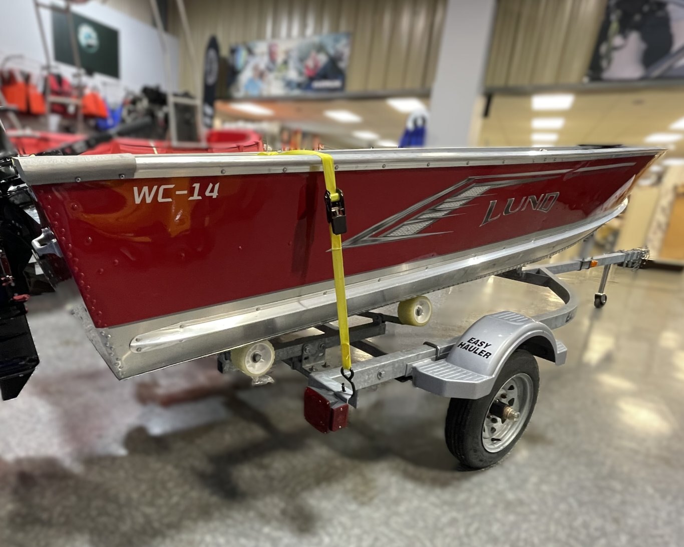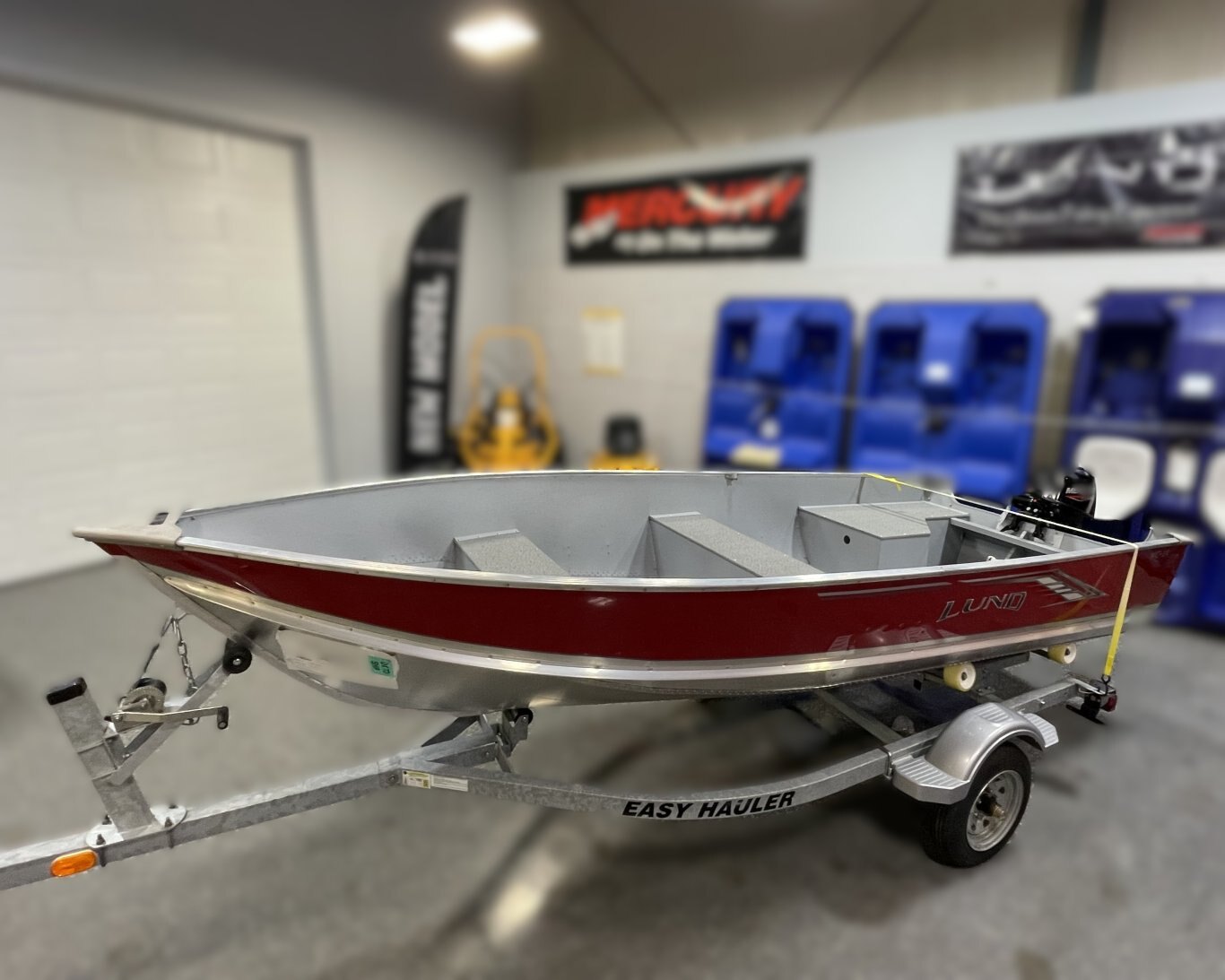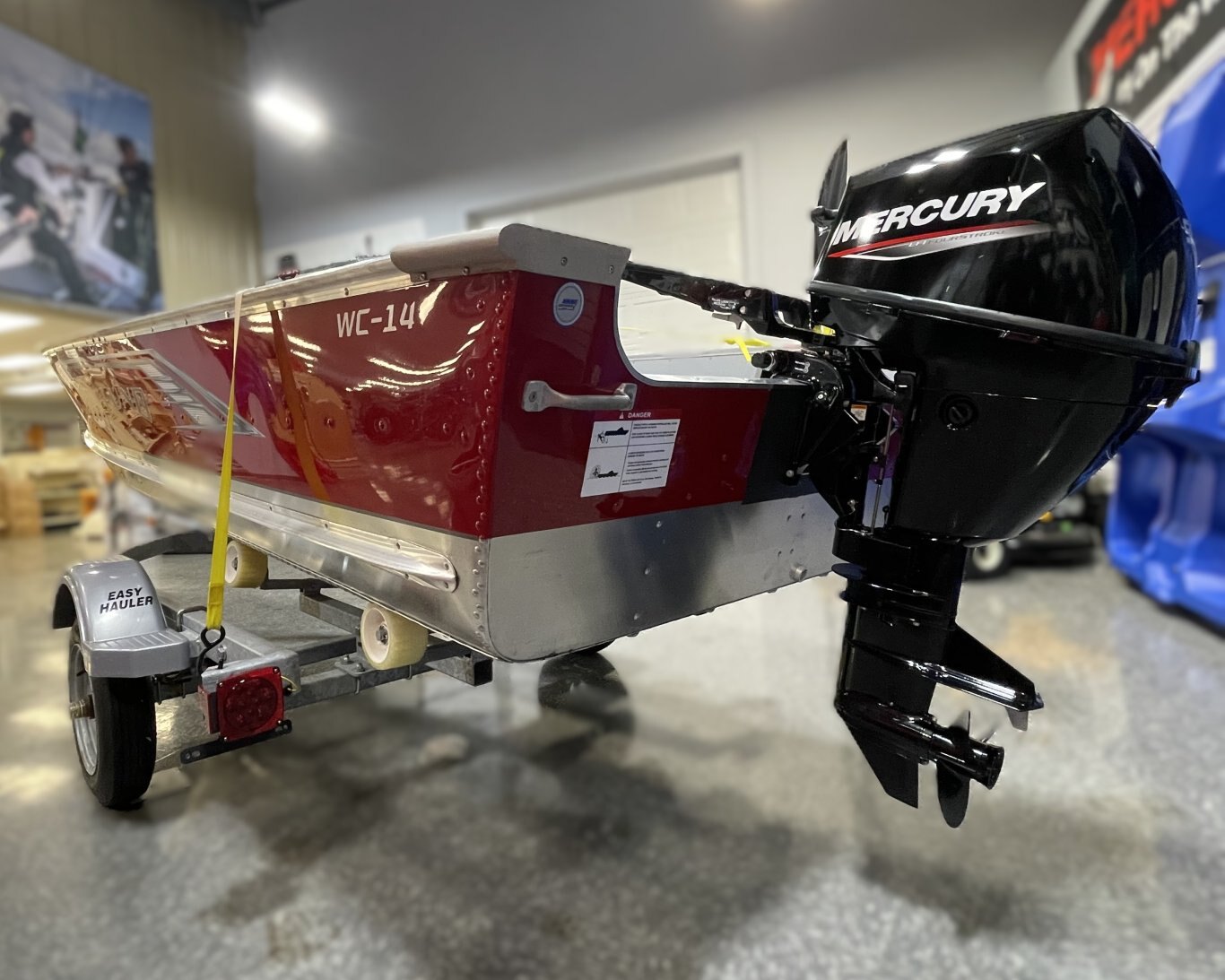 This boat package includes a 2025 Lund WC-14 (Red, Open), 2024 Mercury 9.9HP (MH EFI) and Easy Hauler 1610RG.