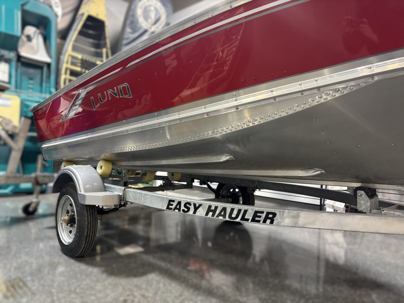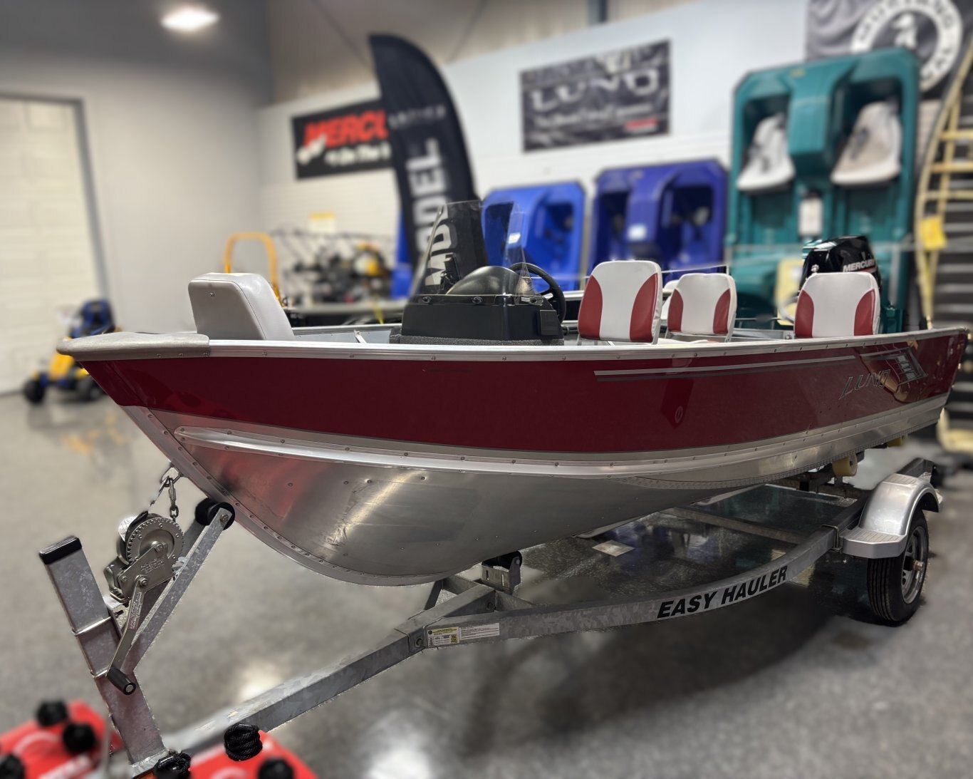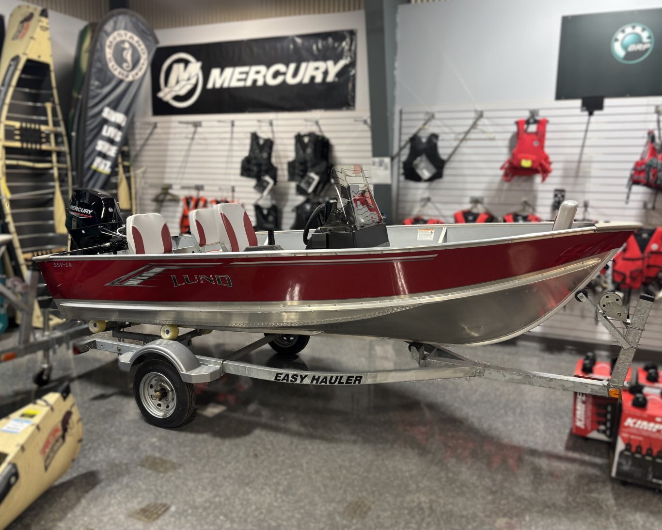 This boat package includes a Lund SSV-14 (Side Console, Red), 2025 Mercury 25HP (ELPT) and Easy Hauler 1410 BG.