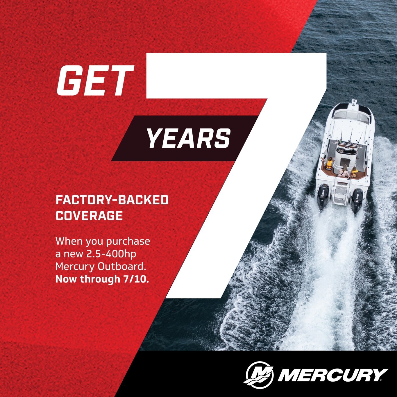 Performance meets peace of mind this summer with the Get 7 extended coverage offer from Mercury. When you purchase a new 2.5-400hp Mercury outboard as part of a new boat package or to repower your current boat between now and July 10, 2025, you’ll receive a total of 7 years of factory-backed coverage. That’s the standard 3-year limited warranty plus an additional 4 years of factory-backed Mercury Product Protection Gold coverage – a value of up to $10,470 per engine. This offer ends July 10, 2025, so call or visit us today to learn more!